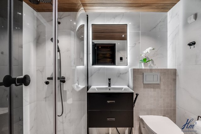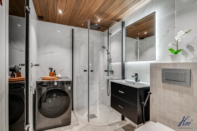 - WC-istuin, suihku, suihkuseinä, pesuallas, peili, allaskaappi, bidee-suihku, ja pesukone