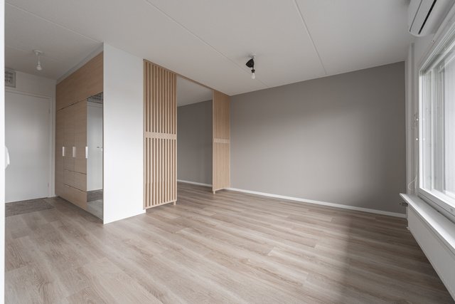 - Olohuone uusittu 2025, seinät maalattu, lattia vinyylilankku, seinät maaalttu, alkovin ja olohuoneen erottaa puusäleikkö, olohuoneessa ilmalämpöpumppu