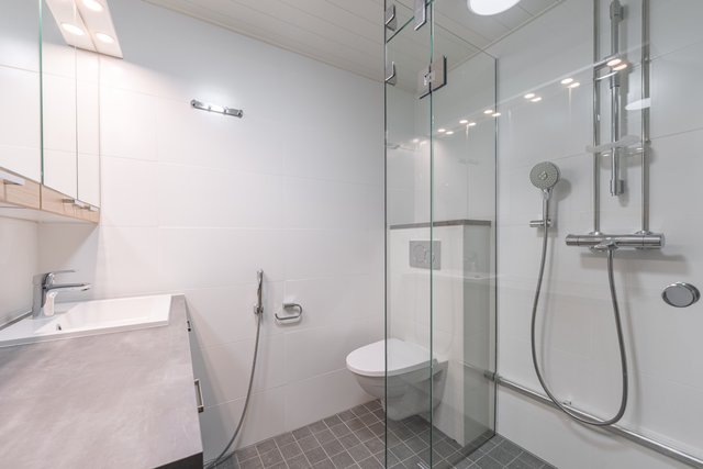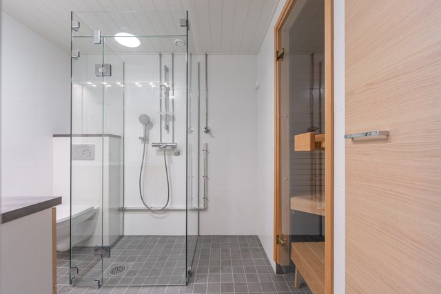 - WC-istuin, suihku, pesukoneliitäntä, suihkukaappi, allaskaappi, bidee-suihku, peilikaappi, pesuallas, lattialämmitys, ja pöytätaso