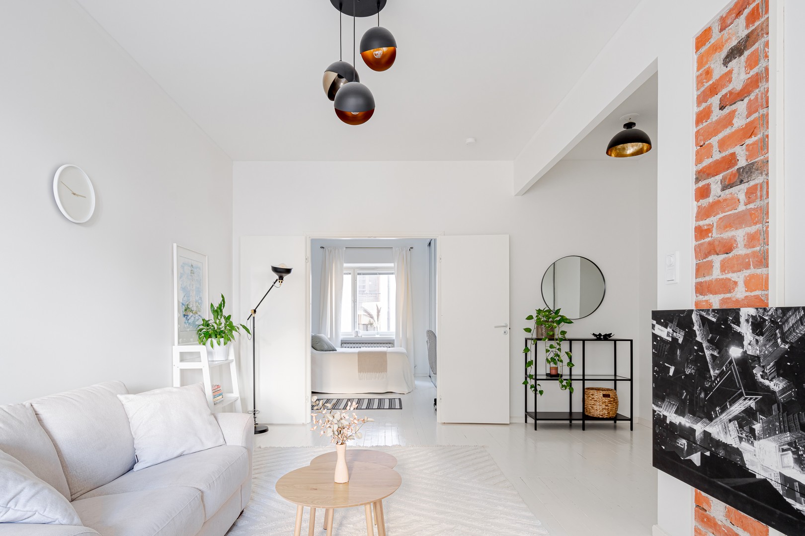 Keittiön tasot ovat puuta ja iso saareke runsaalla säilytystilalla on jokaisen kokkaajan unelma. Keittiöön on jätetty lisäksi tila viinikaapille. Olohuoneeseen mahtuu ruokapöytä ja sohvakalusteet, jossa viihtyy suuremmallakin porukalla. Makuuhuoneeseen saa ison parisängyn ja sieltä löytyy korkeat ja syvät kaapistot peiliovilla. Kylpyhuone on ajaton ja pesukoneelle löytyy oma paikka. Kahteen suuntaan avautuvat ikkunat rauhaisille sisäpihoille päästävät sisään valoa ja luovat avaruutta. Pohjaratkaisu on käytännöllinen ja asunnosta löytyy kaappitilaa niin eteisestä kuin makuuhuoneestakin. Asunto on remontoitu kauttaaltaan vuonna 2019, jolloin pohja muutettiin käytännöllisemmäksi ja asuntoon tehtiin kokonaisvaltainen pintaremontti. Uutta ilmettä saivat niin lattia, kylpyhuone, keittiö, makuuhuone kuin maalipinnatkin.