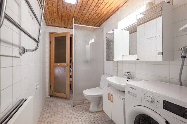 Oman saunan ansiosta voit nauttia rentouttavista löylyistä milloin tahansa. Kylpyhuone on tilava ja sinne mahtuu hyvin pesukone.