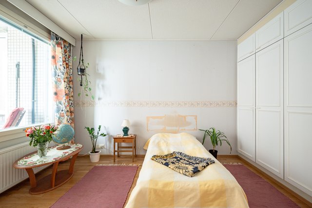 - Makuuhuoneesta käynti lasitetulle parvekkeelle, pitkä seinä kaapistoa.