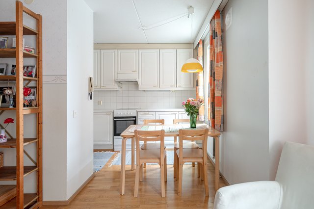 - Avara ikkunallinen tila, jossa runsaasti kaappi- ja tasotilaa. Ruokapöytä mahtuu hyvin.
