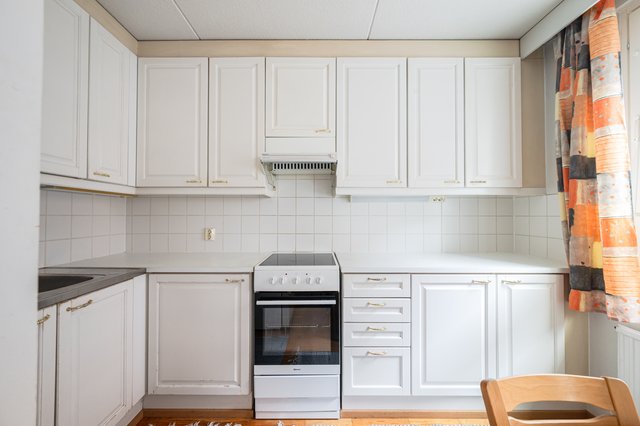 - Jääkaappipakastin, liesituuletin (valo vaatii korjausta), liesi (uunin tiiviste vaatii korjausta), ja työvalo (loisteputkivalaisin, muovisuojus murtunut)