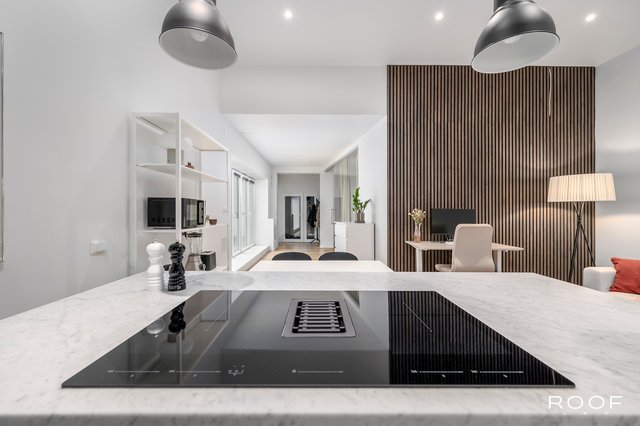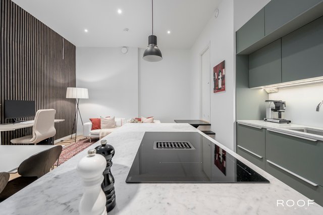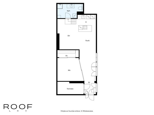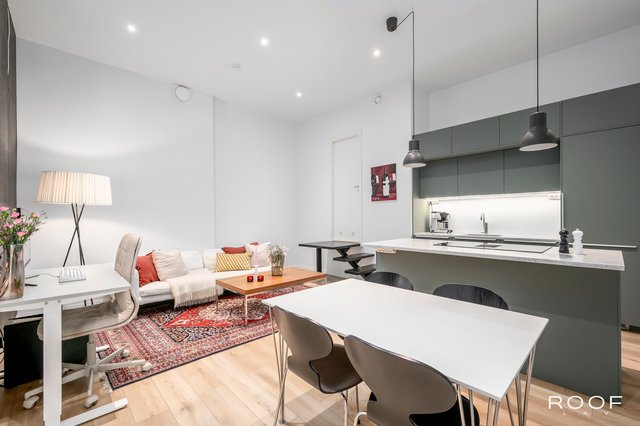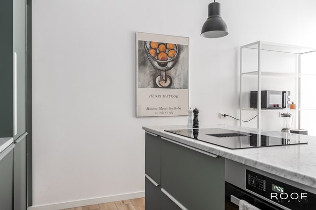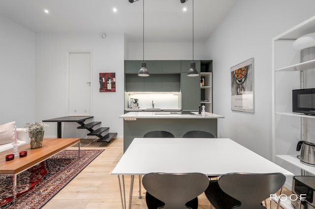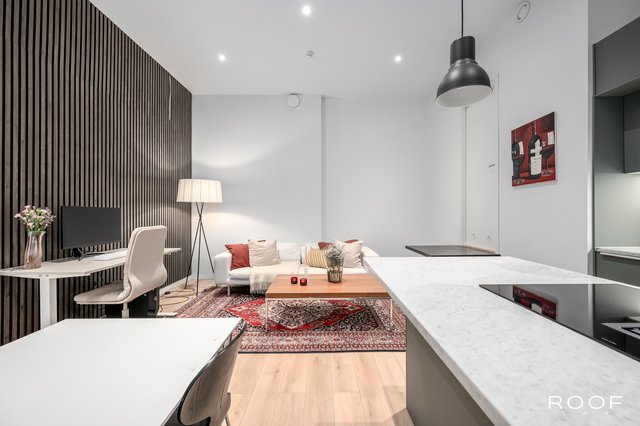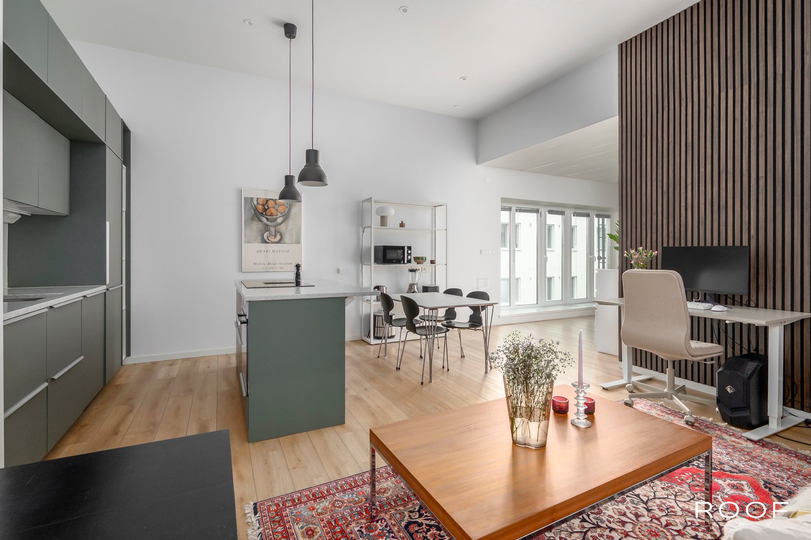 Asunnon pohjaratkaisu on toimiva ja avara. Tyylikäs keittiö ja olohuone muodostavat yhtenäisen, avonaisen oleskelutilan, joka soveltuu loistavasti niin arkeen kuin yhdessäoloon. Suuret ikkunat tuovat runsaasti luonnonvaloa ja avautuvat taloyhtiön rauhalliselle sisäpihalle, joka takaa viihtyisyyden ja yksityisyyden kaupungin sykkeessä.