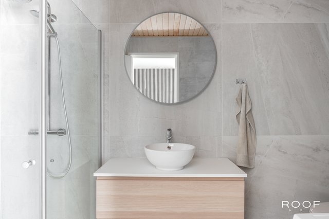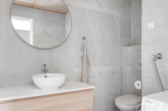 - WC-istuin, suihku, lattialämmitys, suihkuseinä, pesukoneliitäntä, allaskaappi, ja peilikaappi
