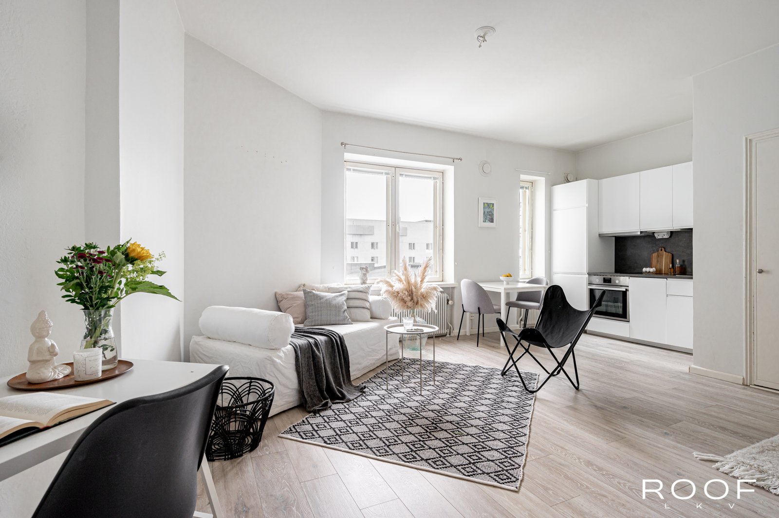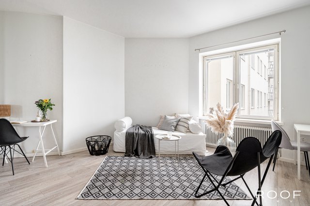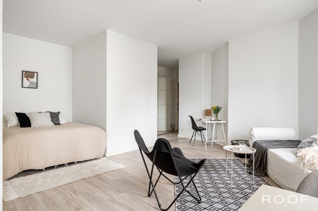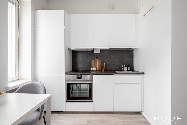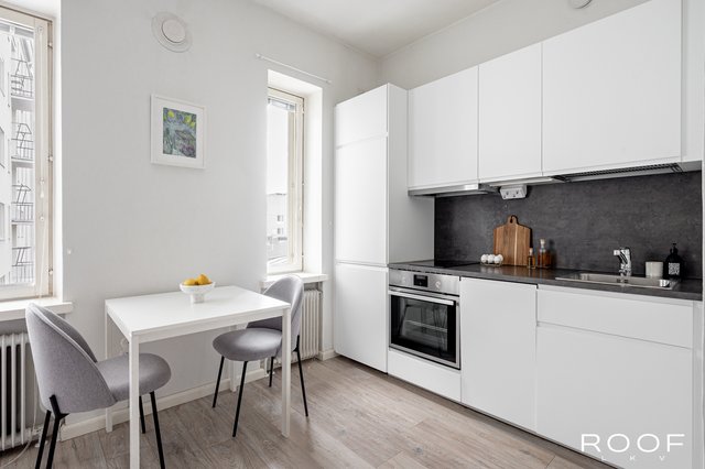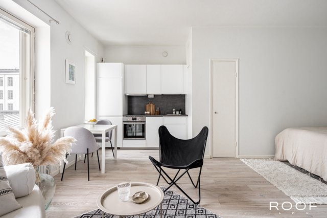 Tämän asunnon pohjaratkaisu on erinomainen. Hyvin varusteltu avokeittiö ja olohuone luovat toimivan kokonaisuuden ja hyvän kokoinen makuualkovi helpottaa huoneen sisustamista.