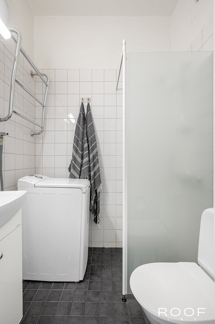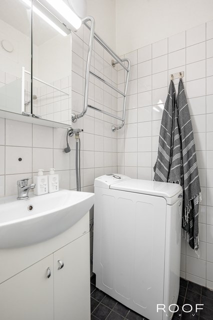 - WC-istuin, suihku, pesukoneliitäntä, pesukone, peilikaappi, lattialämmitys, ja allaskaappi