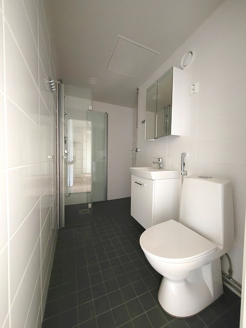 - Allaskaappi, wc-istuin, pesukoneliitäntä, suihkuseinä, peilikaappi, suihku, ja kiinteät valaisimet