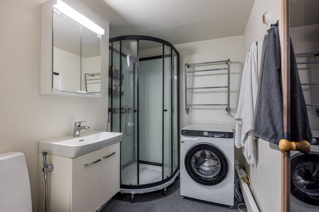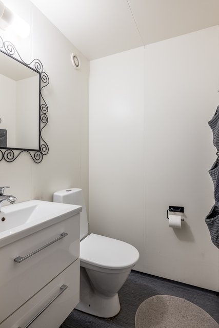 - WC-istuin, suihku, suihkukaappi, pesukoneliitäntä, peilikaappi, pesuallas, allaskaappi, ja bidee-suihku