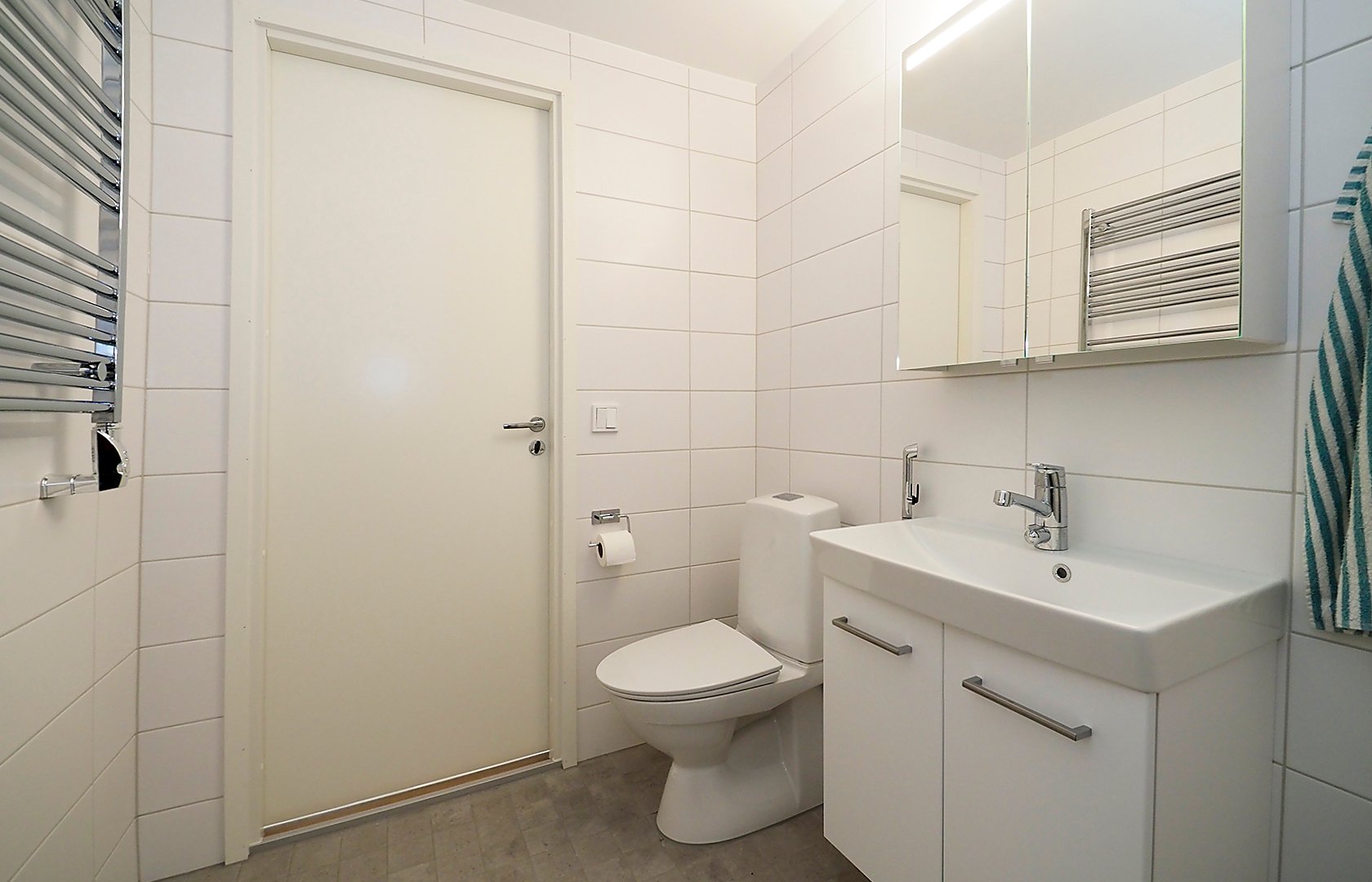 - WC-istuin, pesuallas, peilikaappi, pesukoneliitäntä, suihkuseinä, lattialämmitys, bidee-suihku, allaskaappi, ja peili