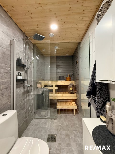 - Tyylikäs kylpyhuone on kuin pieni spa-keidas. Saunan väliseinä on kokonaan lasia ja ihana sadesuihku on ripaus ylellisyyttä. Tehosteseinä on samanvärinen kuin lattia, joka on tarkkaan harkittu yksityiskohta. Varustuksena: sadesuihku, kääntyvä suihkuseinä, peili- ja allaskaappi, lisäseinäkaapit, wc-istuin ja pesukoneliitäntä. Seinälaatat kokoa 25x40cm ja lattialaatat 10x10cm