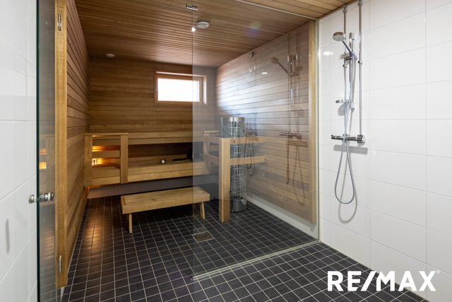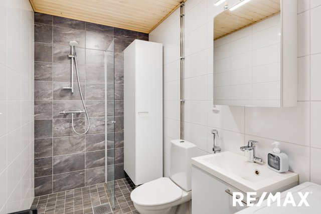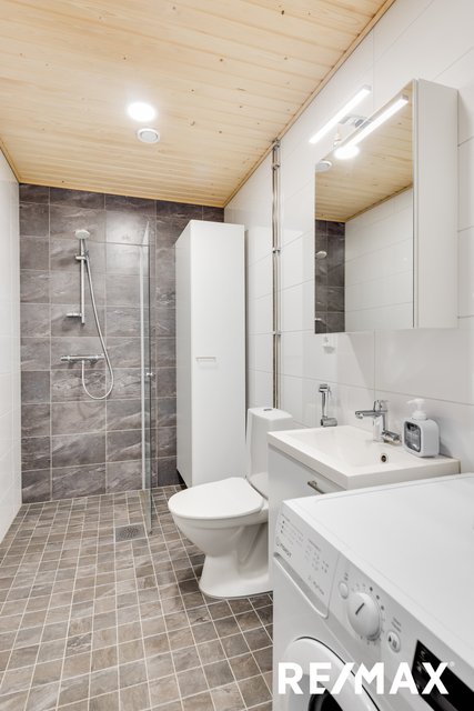 - WC-istuin, suihku, pesukoneliitäntä, peilikaappi, allaskaappi, pesuallas, lattialämmitys, ja kylpyhuoneen kaappi