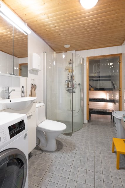 - Vinyylilankku, kylpyhuoneessa ja saunassa keraaminen laatta