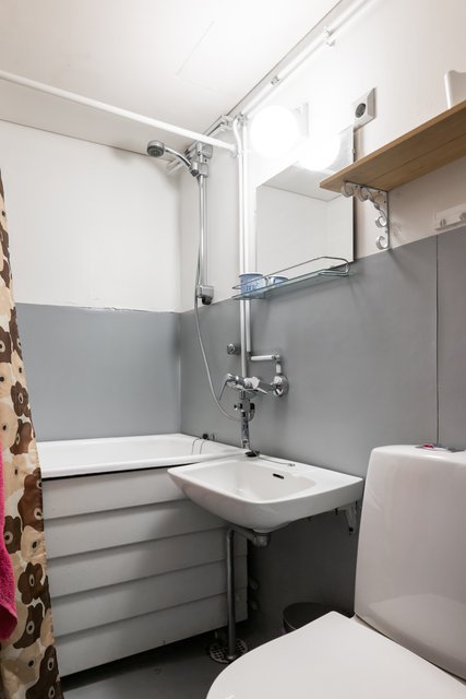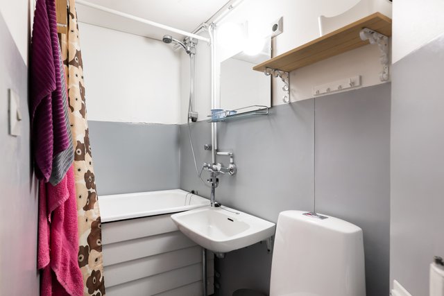 - WC-istuin, suihku, peili, pesukoneliitäntä, pesuallas, bidee-suihku, ja kylpyamme