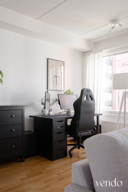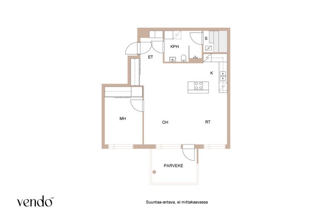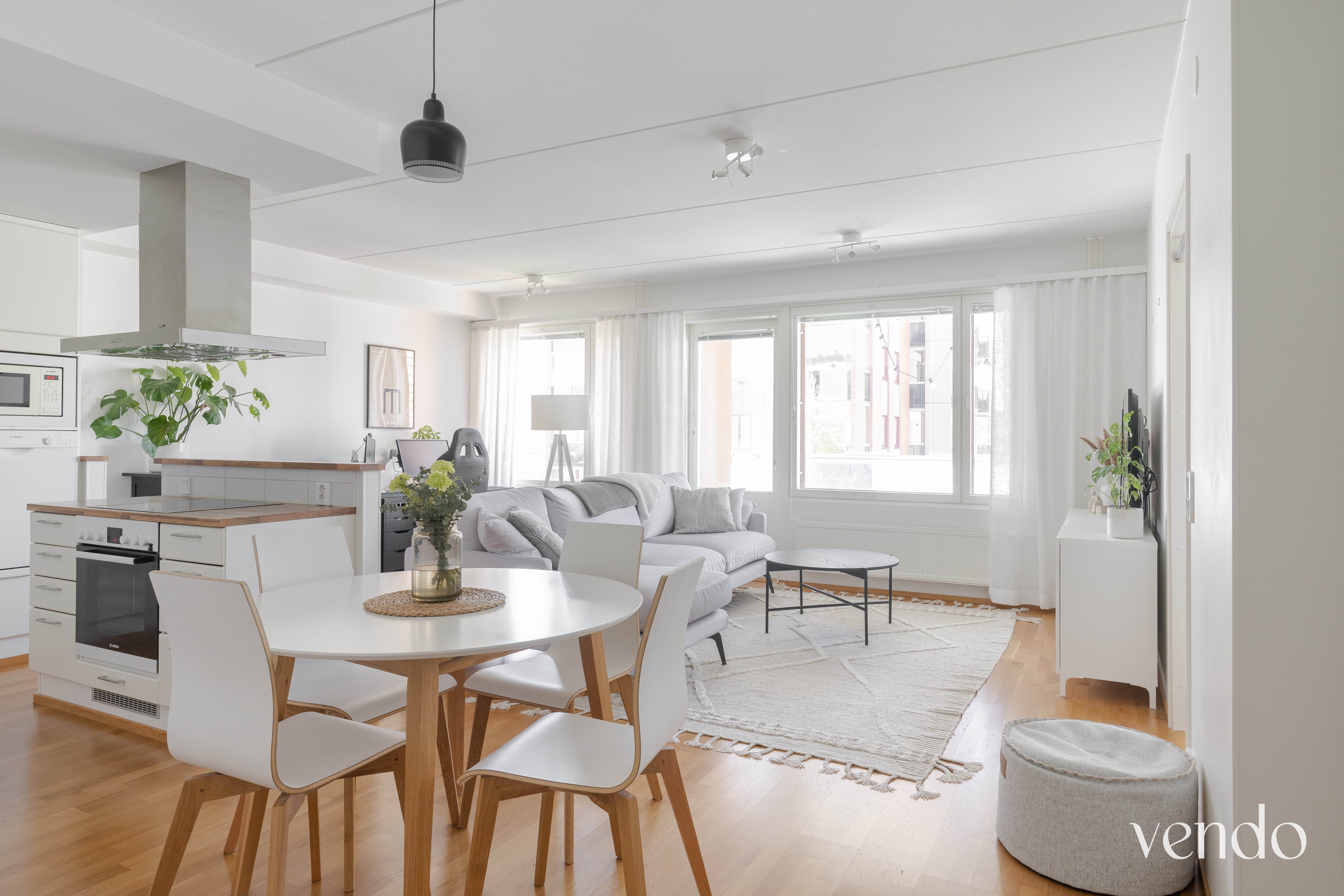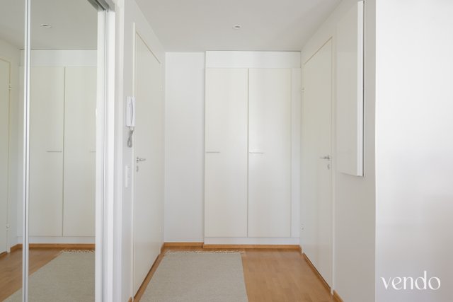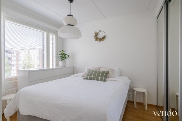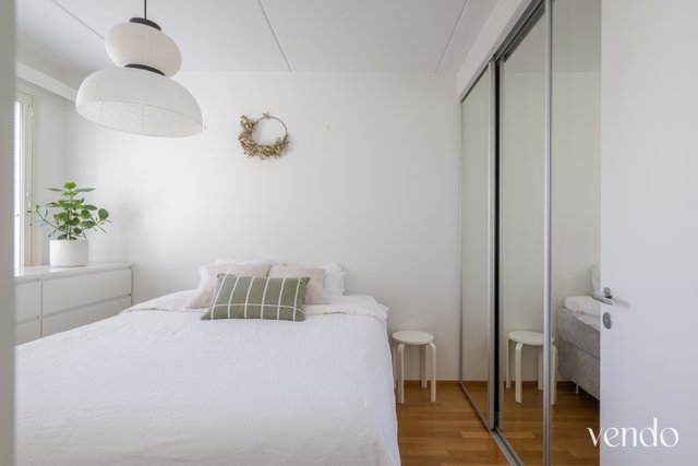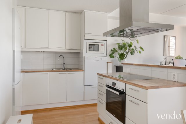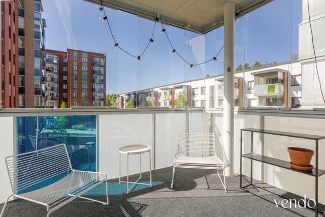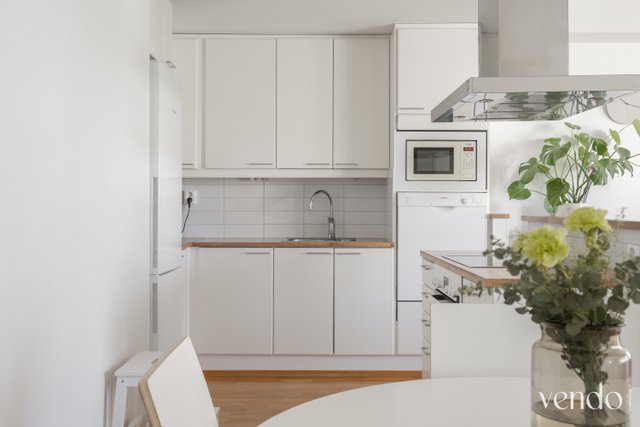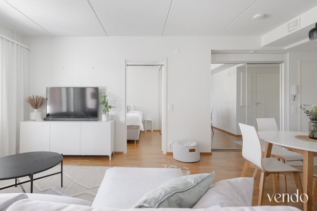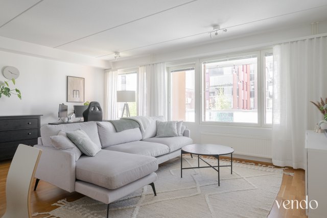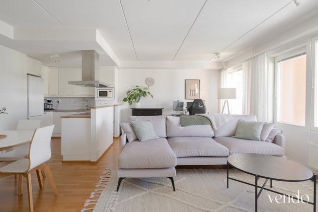 Tässä kodissa on erinomainen pohjaratkaisu ja hyvin tilaa kahdelle viihtyisään asumiseen. Reilujen neliöiden ansiosta mikään tila ei ole ahdas. Keittiö, ruokailutila ja olohuone ovat saarekkeen rytmittämää avaraa kokonaisuutta, missä viihtyy isommallakin porukalla. Avaran tilan tunnelma jatkuu hyvän kokoiselle lasitetulle parvekkeelle. Materiaalit ovat laadukkaat ja värivalinnat aikaa kestävät. Tyylikäs ilme kantaa kautta koko kauniisti kohdellun kodin.