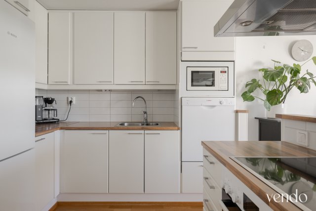- Jääkaappipakastin, erillisuuni, liesituuletin, mikroaaltouuni, astianpesukone, ja saareke