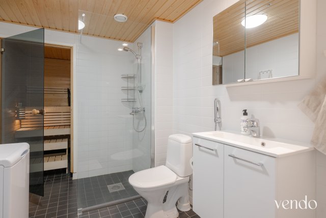 - Suihku, suihkuseinä, peilikaappi, allaskaappi, wc-istuin, bidee-suihku, pesukoneliitäntä, lattialämmitys, ja pyykkikaappi