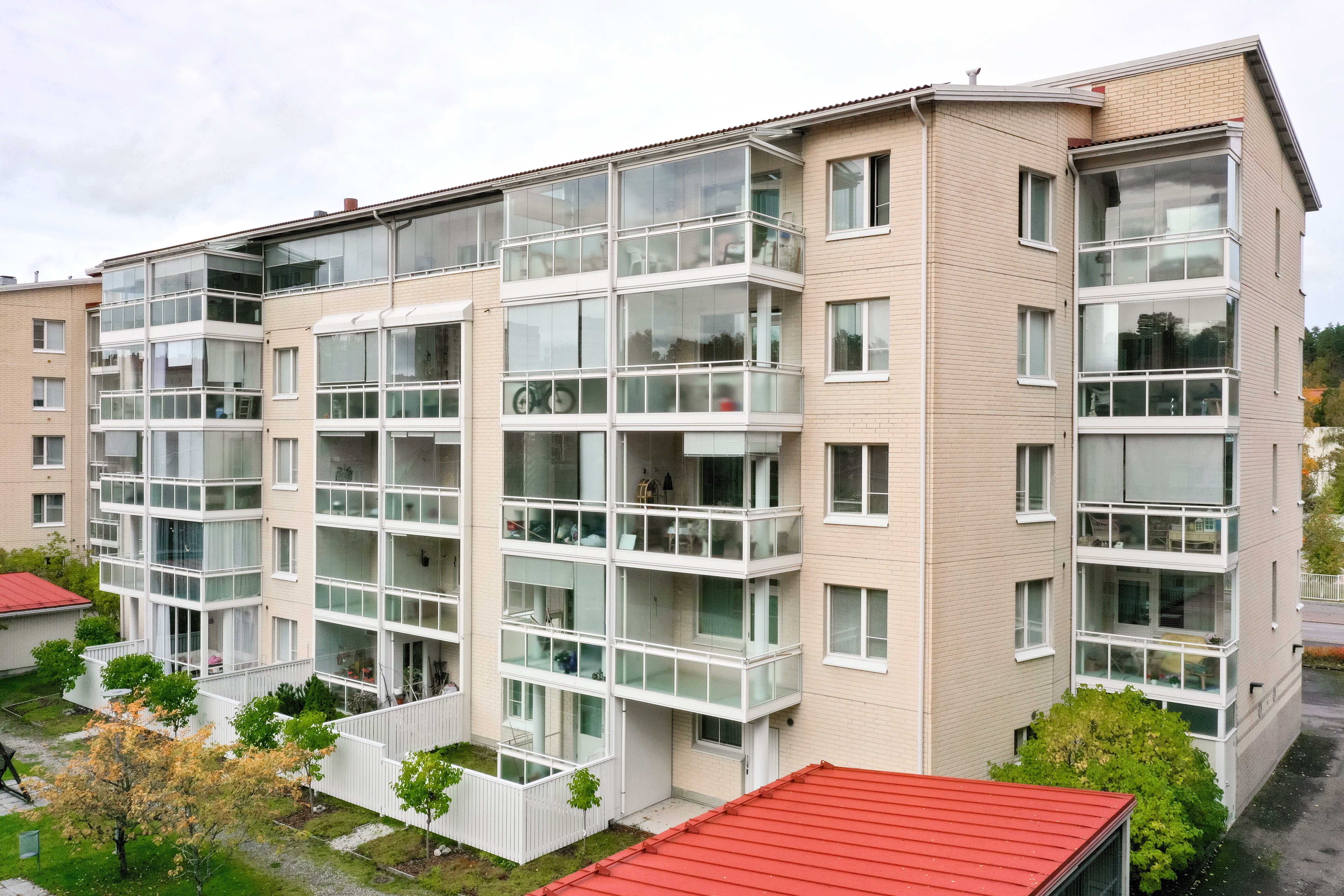 Erityisen viehättävä yksityiskohta on lasitettu parveke, joka suuntautuu etelään. Se on kuin lisähuone, jossa voit nauttia auringosta ja näkymistä ympäri vuoden. Säilytystilaa löytyy vaatehuoneen ja kaapistojen muodossa, joten järjestys säilyy helposti.