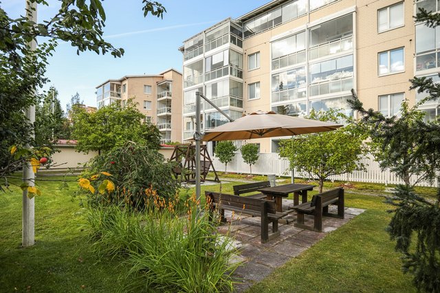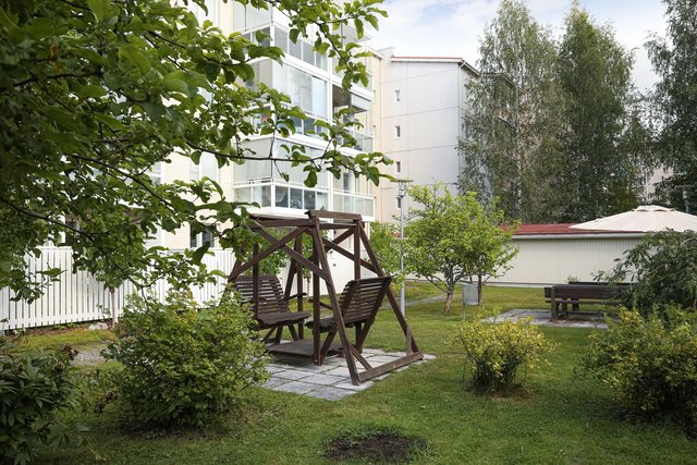- Viihtyisä sisäpiha, jossa istutuksia ja keinu.