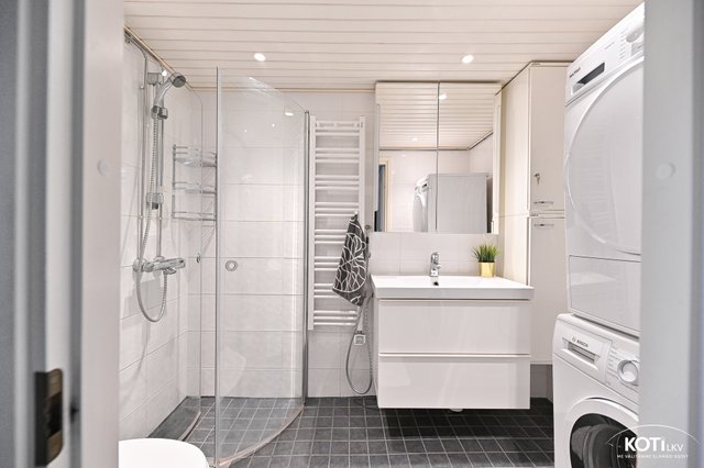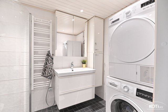 - WC-istuin, suihku, suihkuseinä, pesukoneliitäntä, lattialämmitys (Sähkötoiminen), ja kaapisto