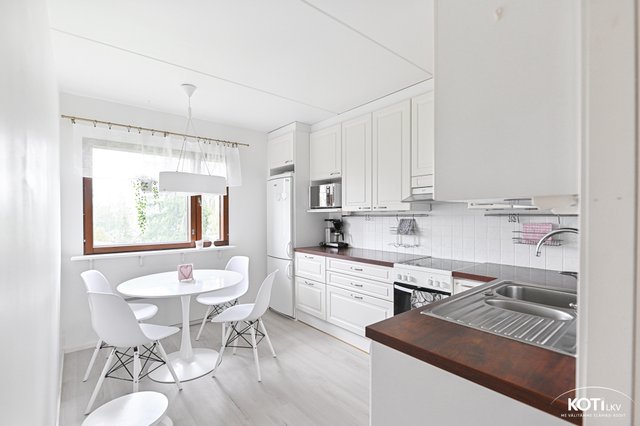 - Keittiöön mahtuu ruokapöytä. Ikkunasta avarat näkymät koilliseen.