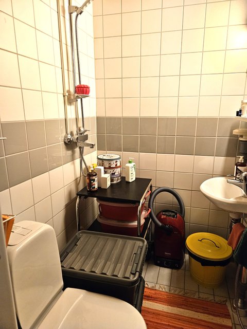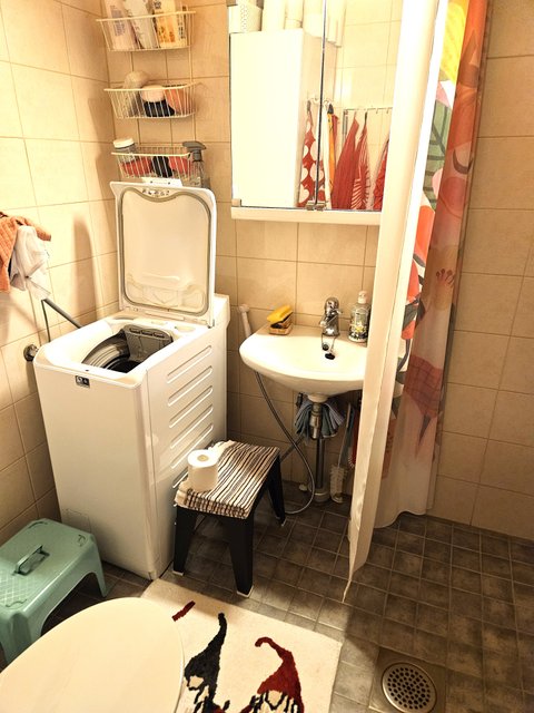 - WC-istuin, suihku, peili, lattialämmitys, ja pesukoneliitäntä