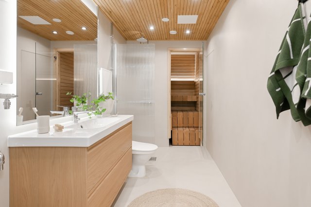 - WC-istuin, suihku, suihkuseinä, lattialämmitys, bidee-suihku, pesuallas, peili, pesukoneliitäntä, ja allaskaappi