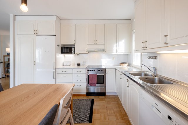 - Jääkaappi, erillinen pakastin, uuni, liesi, astianpesukone, liesituuletin, ja keittiösaareke