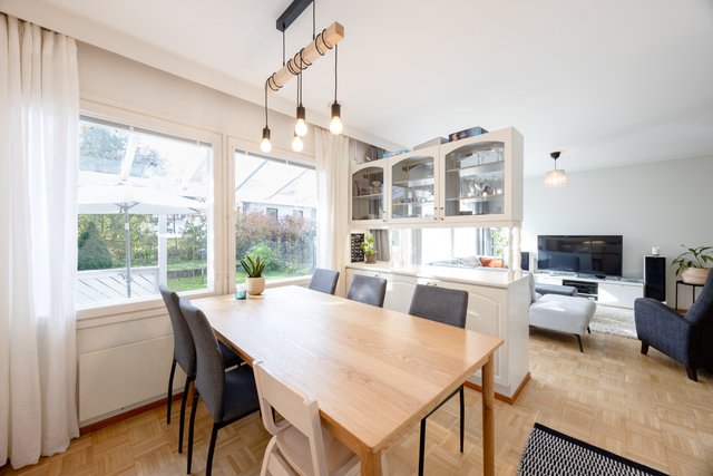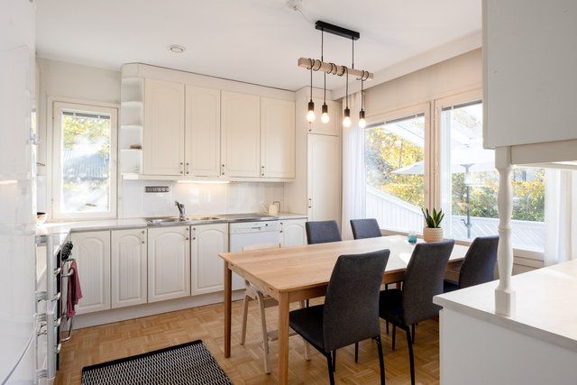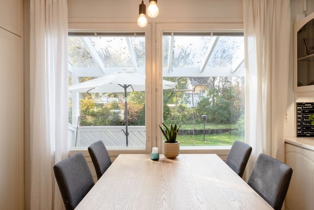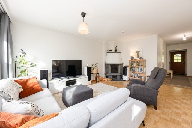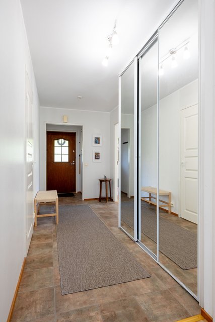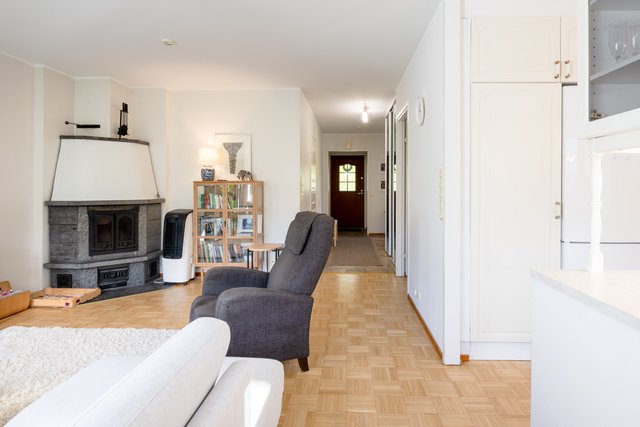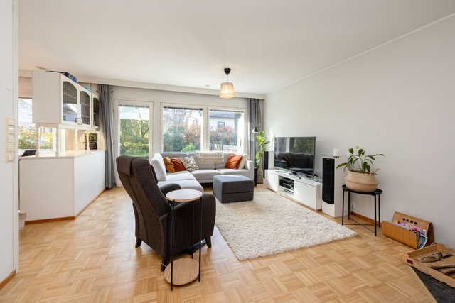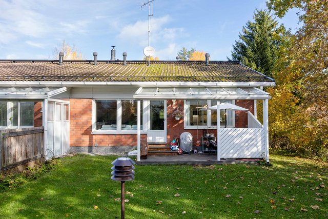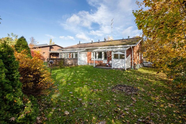 Viehättävä kolmio omalla pihalla vehreällä ja rauhallisella pientaloalueella. Huoneisto koostuu kahdesta kerroksesta. Asuinkerroksessa on kaksi hyvänkokoista makuuhuonetta ja toisessa on myös vaatehuone. Saunallinen kylpyhuone on tilava ja pesutornillekin löytyy oma paikka. Olohuoneesta on käynti terassille ja pihalle. Olohuoneessa on varaava takka ja iso keittiö on vieressä. Alakertaan (69 m2) on kulku ulkokautta ja se on monien mahdollisuuksien tila, jonka voit muokata omien tarpeidesi mukaan. Lämmintä tilaa tässä kokonaisuudessa on n. 120 m2 + kylmää tilaa n. 27 m2. Sähkönkulutus on ollut edellisellä vuokralaisella (3 hlö) n. 13 500 kWh (sisältää lämmityksen ja käyttösähkön). Edulliset asumiskulut, hoitovastike on ollut n. 210 € / kk, eli lämpimien tilojen osalta (n. 120 m2) n. 1,75 € / m2.