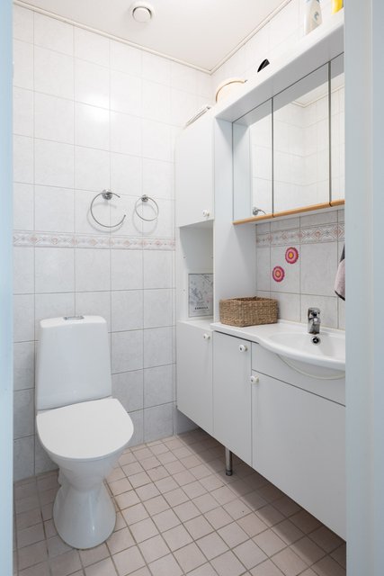 - Suihku, pesukoneliitäntä, lattialämmitys, peilikaappi, pesuallas, ja allaskaappi