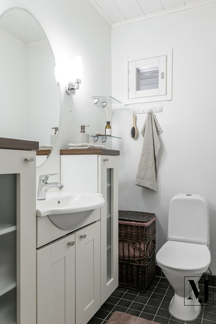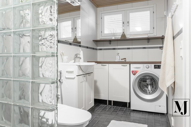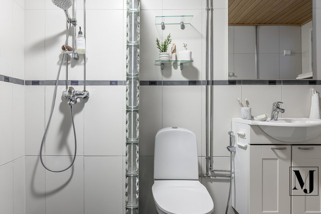 - WC-istuin, suihku, suihkuseinä, pesukoneliitäntä, lattialämmitys, pesuallas, peili, allaskaappi, ja bidee-suihku