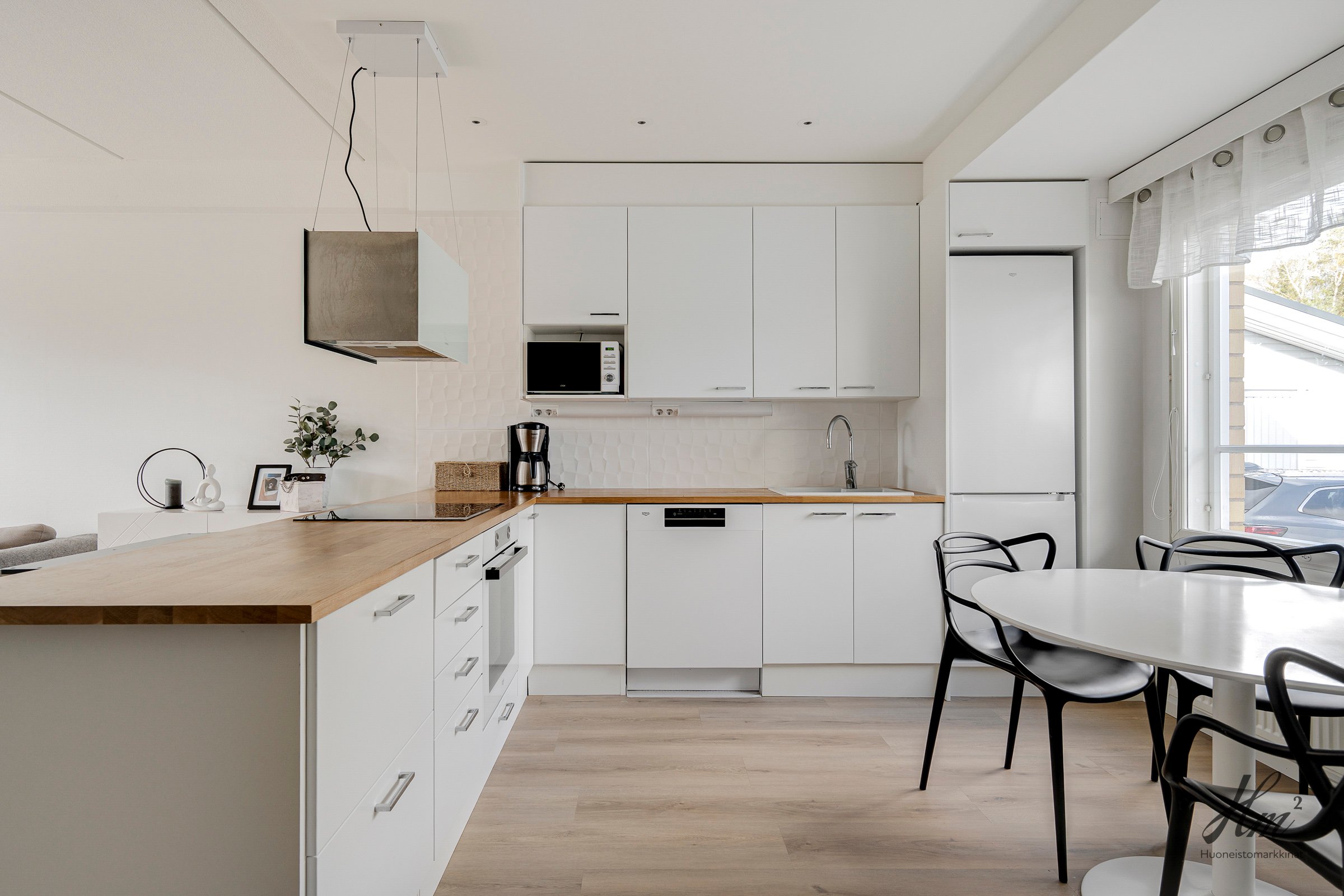 - Keittiön varusteina jääkaappi/pakastin, induktioliesi, erillisuuni, liesituuletin, astianpesukone ja kiinteät valaisimet. Lattia vinyylilankkua.