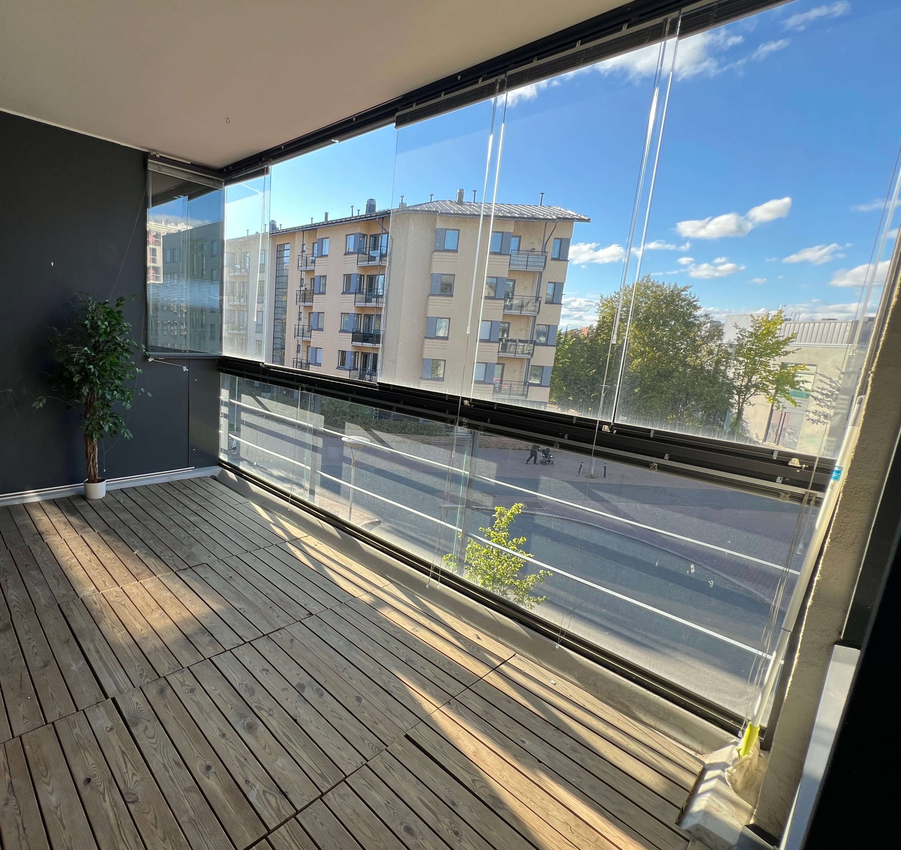 Siistikuntoinen ja tehokas kolmio, jossa on iso lasitettu parveke.