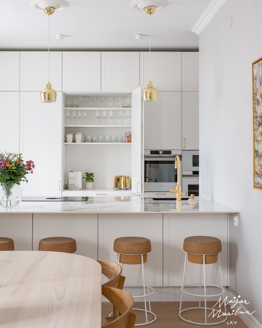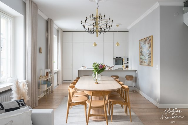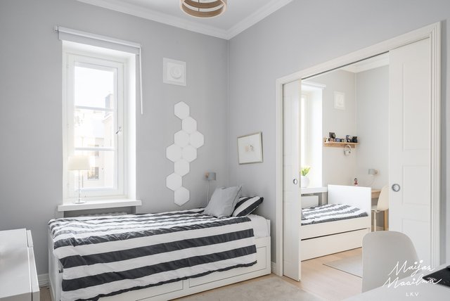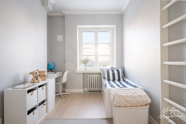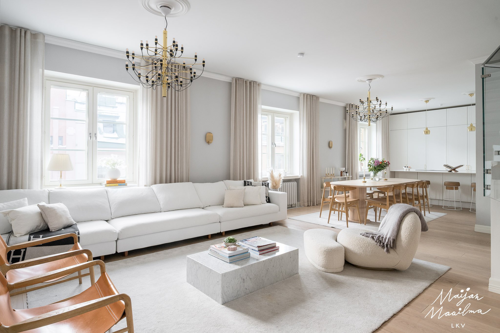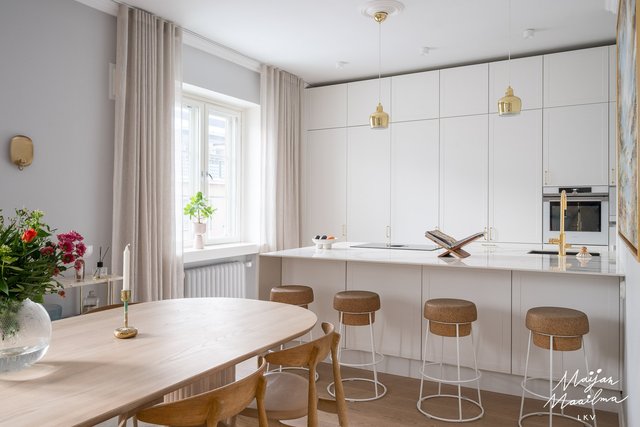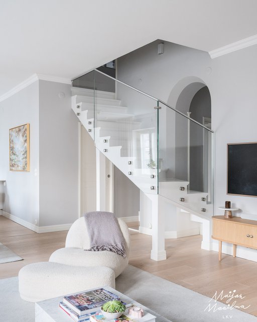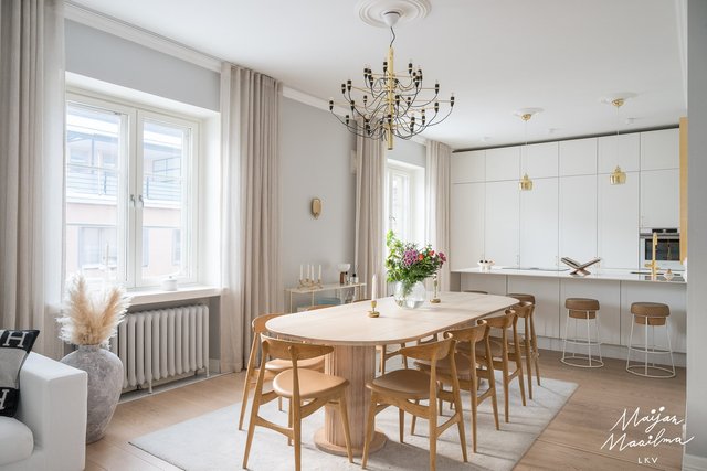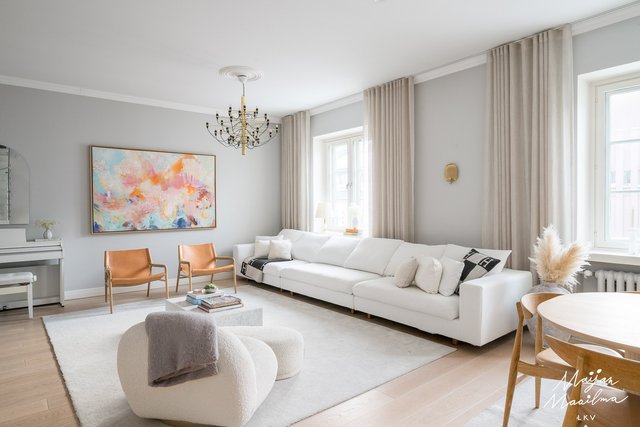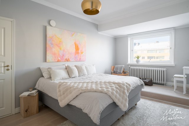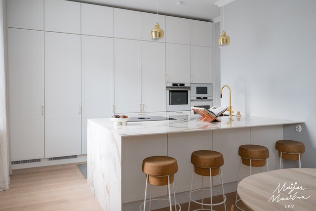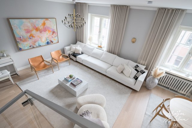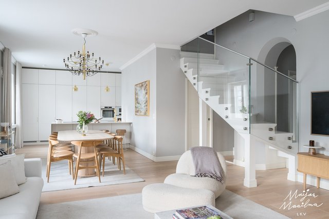 Tarjolla kaunis ja erittäin laadukkaasti remontoitu kaksikerroksinen huoneisto Ullanlinnassa. Huoneistoon on tehty mittava remontti vuonna 2020. Tinkimättömästä suunnittelusta on vastannut sisustusalan ammattilaiset. Remontissa muun muassa asunnon keittiö ja kylpyhuoneet on uusittu sekä kaikki lattia- ja seinäpinnat kunnostettu ja asunnon vaatekaapistot uusittu. Asunnossa on neljä makuuhuonetta, joista päämakuuhuone sijaitsee asunnon toisessa kerroksessa ullakkokerroksessa. Päämakuuhuoneen yhteydessä on toinen asunnon upeista kylpyhuoneista. Alakerran kylpyhuoneessa on tilaa myös pyykkihuollolle. Avokeittiön upeat kattoa hipovat Aina-keittiöiden kaapistot ja suuri keittiösaareke, jonka ympärillä on myös tilaa baarijakkaroille, on näyttävä kokonaisuus. Keittiön keraamiset tasot, aamiaiskaappi ja laadukkaat kodinkoneet ovat ylelliset. Olohuone-ruokailutila-avokeittiö on yhtä suurta kokonaisuutta – täällä on tilaa viettää perheen yhteisiä hetkiä tai kestittää ystäviä. Tunnelmaa tuo asunnon kunnostettu takka. Remontin yhteydessä uusittiin myös asunnon sähköjohdot ja sähkökeskus sekä uusittiin asunnon toiseen kerrokseen johtavien portaiden kaiteet näyttäviksi lasikaiteiksi. Valaistussuunnitteluun on panostettu muun muassa himmennettävien valaistusratkaisujen muodossa. Ikkunanäkymät kantavat yli kaupungin kattojen, läpitalonhuoneisto on valoisa. Tämä asunto on kerrassaan upea ja kuvattu myös sisustuslehteen!