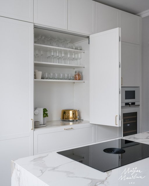 - Avokeittiö: Tammiparkettilattia, maalatut seinät. Aina-merkin keittiökaapistot. Keittiösaareke, jääkaappi, pakastin, uuni, liesi integroidulla tuulettimella, viinikaappi ja astianpesukone. Keraamiset tasot. Aamiaiskaappi.
