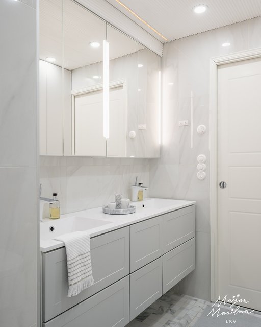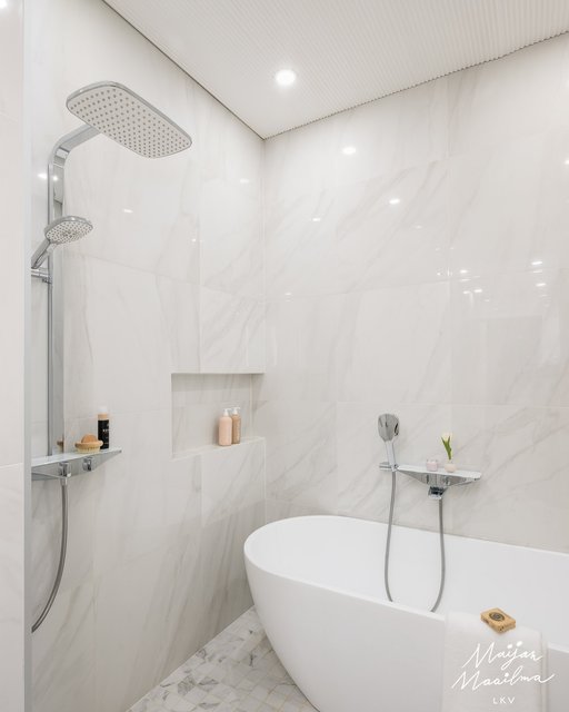 - Kylpyhuone/wc 1 ja kht (alakerta): Lattiat ja seinät laattaa. Suihku, kylpyamme, allas, allashana, bideesuihku, allaslaatikosto, peilikaappi ja seinäkiinnitteinen wc-istuin. Pesukoneliitäntä, pesukonetornille kaappi ja lattialämmitys. Kylpyhuone/wc 2 (ullakkokerros): Lattiat ja seinät laattaa. Suihku, allas, allashana, bideesuihku, allaslaatikosto, peilikaappi ja seinäkiinnitteinen wc-istuin. Pyyhepatteri ja lattialämmitys.