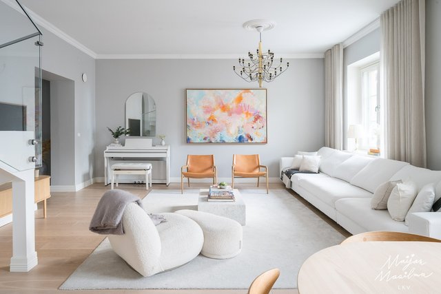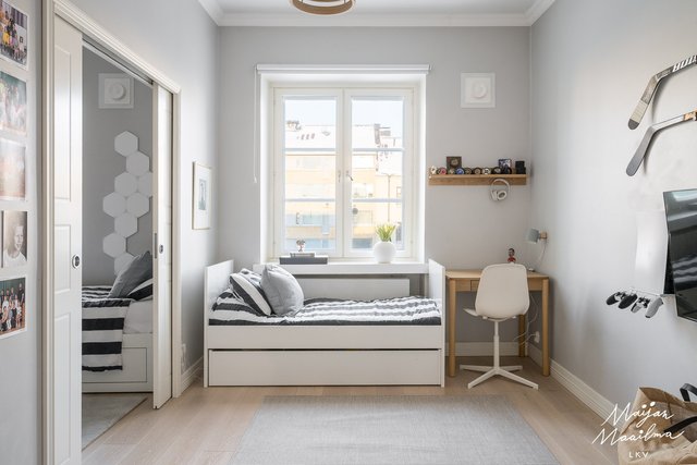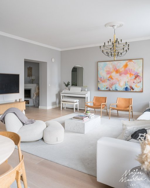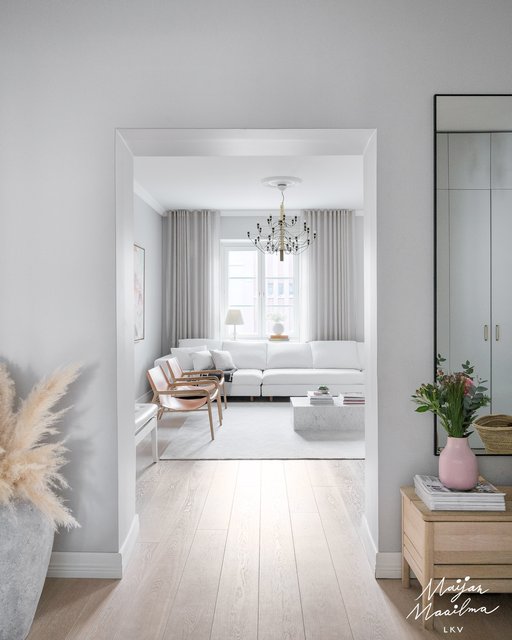 - Olohuone: Tammiparkettilattia, maalatut seinät.