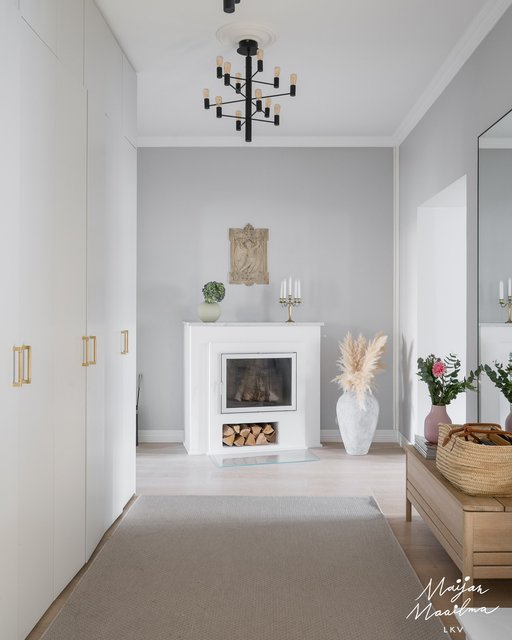 - Eteishalli: Tammiparkettilattia, maalatut seinät. Vaatekaapistot. Puiset portaat ullakkokerrokseen. Takka.
