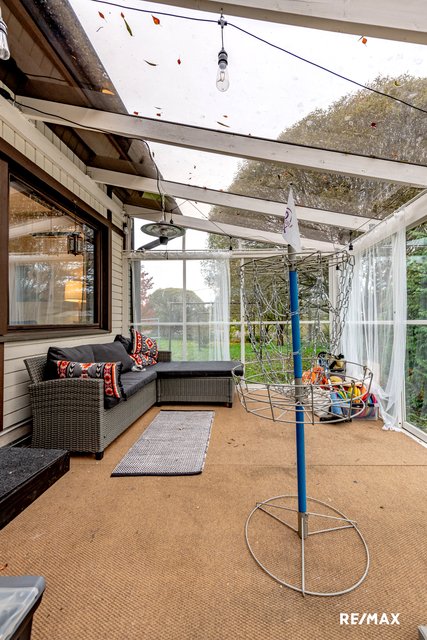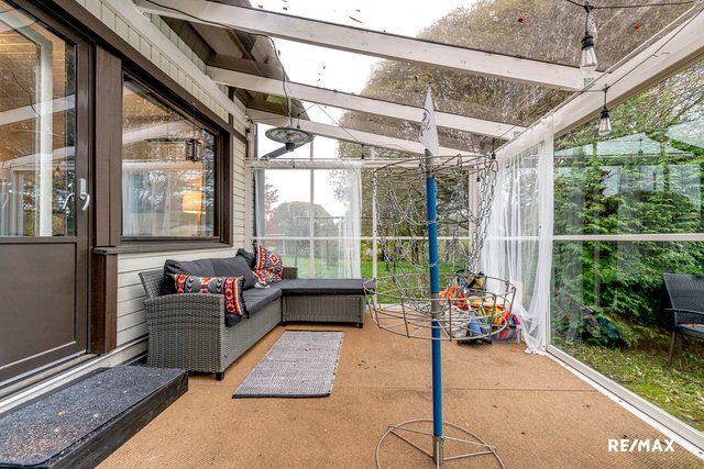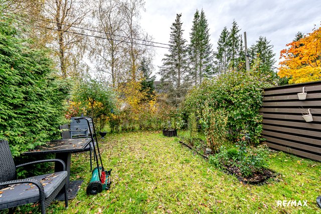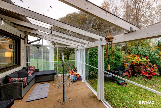Olohuoneesta on kulku takapihalle, sekä katetulle terassille. Suojaisa takapiha koostuu nyt lähinnä nurmesta ja pensaista, mutta innokas puutarhaihminen loihtii tästä oman viherkeitaan.