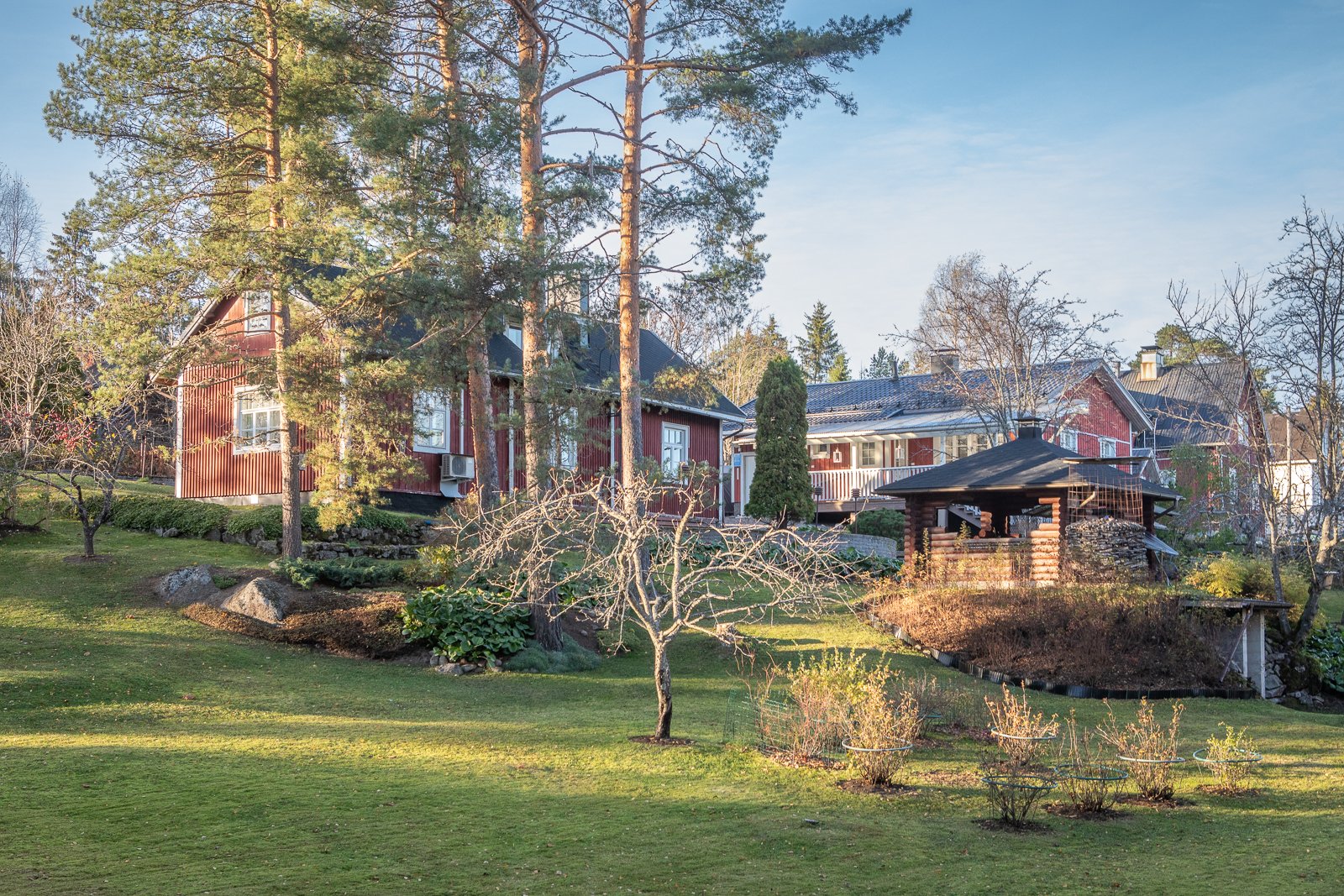 - Kaunis hyvin hoidettu pihapiiri, jossa on pengerrystä tehty muurikivillä. Ajotie on sora murskeella. Nurmella oleva piha, jossa marjapensaita ja muutama omenapuu sekä istutuksia.