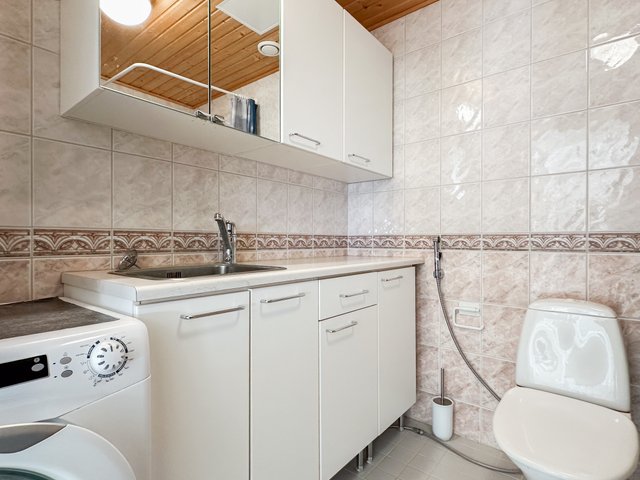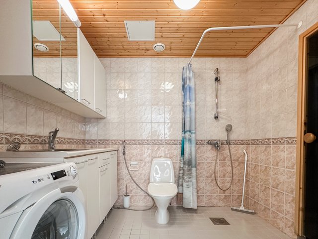 - Suihku, wc-istuin, pesukoneliitäntä, bidee-suihku, pesuallas, allaskaappi, ja peilikaappi