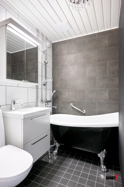 - 2krs. kph:n varustus: Kylpyamme, wc-istuin, allaskaappi, peilikaappi, lattialämmitys, rättipatteri, laattalattia, kaakeli seinät