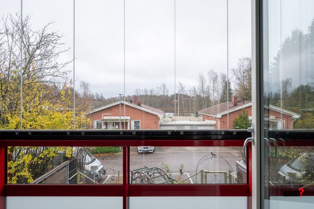Yläkerrassa on kaksi makuuhuonetta, joista toisesta on käynti takapihalle. Tyylikkäässä kylpyhuoneessa on design-amme rentoutumista varten, ja olohuone avautuu lasitetulle parvekkeelle, josta aukeavat rauhalliset näkymät Lammaslammelle. Keittiö on kompakti ja toimiva, tarjoten kaiken tarpeellisen sujuvaan arkeen.