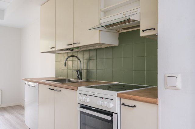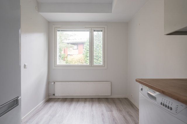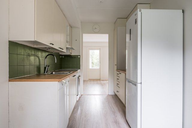 - Jääkaappipakastin, uuni, liesituuletin, astianpesukone. Läpikuljettava keittiö, jonne mahtuu myös pöytä.