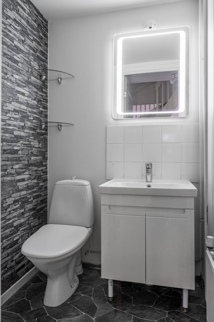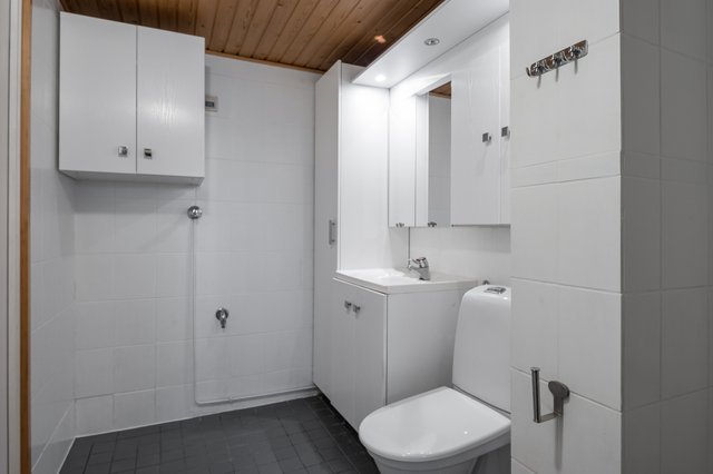 - WC-istuin, suihku, peilikaappi, allaskaappi, ja pesukoneliitäntä