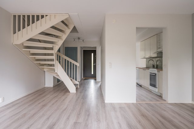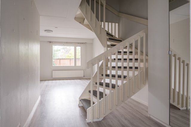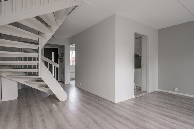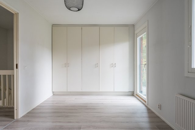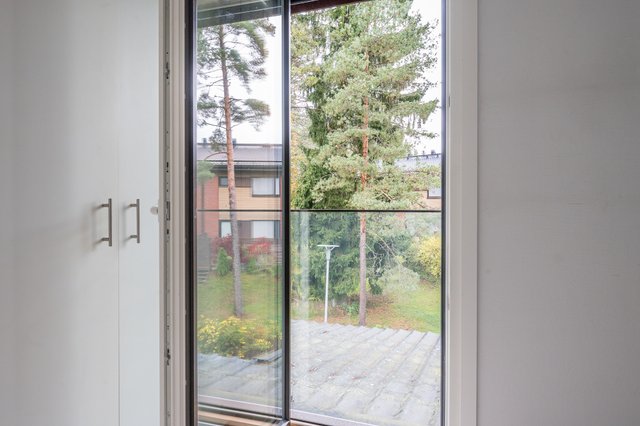 Asunnon alakerrassa on iso ja avara olohuone josta on kulku huoneiston takapihalle. Keittiöstä löytyy kaikki tarvittava ja pöytä mahtuu ikkunan ääreen. Asunnon yläkerrassa on kaksi tilavaa makuuhuonetta. Yläkerran kylpyhuoneen yhteydessä on huoneiston oma sauna ja pesukone mahtuu laatoitettuun kylpyhuoneeseen helposti. Kylpyhuoneessa on vessa ja erillinen wc löytyy lisäksi alakerrasta. Yläkerran ikkunoista avautuvat näkymät etupihalle. Takapiha on suojaisa ja helppohoitoinen.