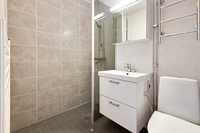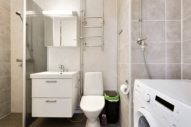 - Allaskaappi, wc-istuin, suihku, pesukone, pesukoneliitäntä, peilikaappi, ja bidee-suihku