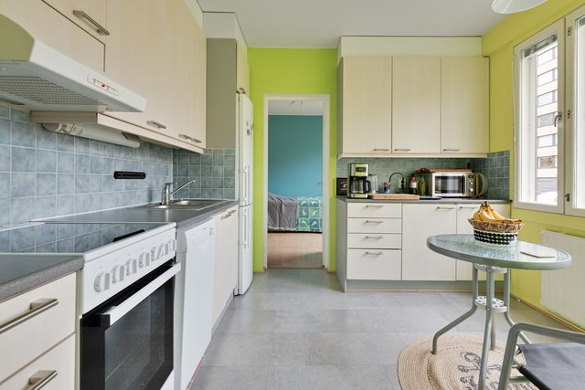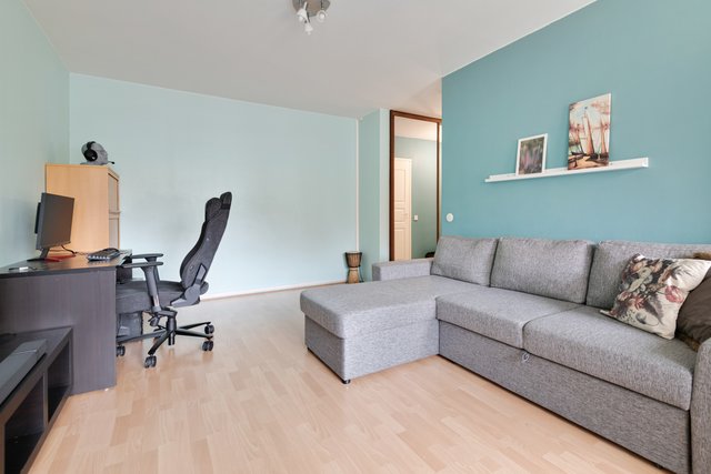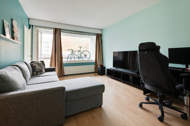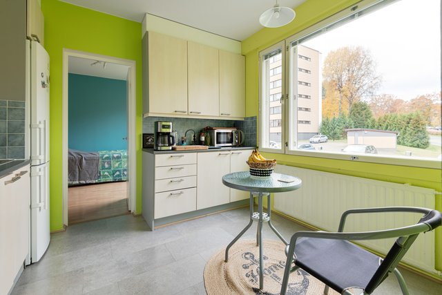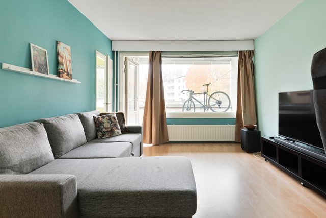 Asunnossa on tilava olohuone, josta on käynti lasitetulle parvekkeelle. Parveke avautuu pohjoiseen, tarjoten rauhallisen paikan rentoutumiseen. Keittiö on hyvin varusteltu ja siellä on tilaa pienelle ruokailuryhmälle.