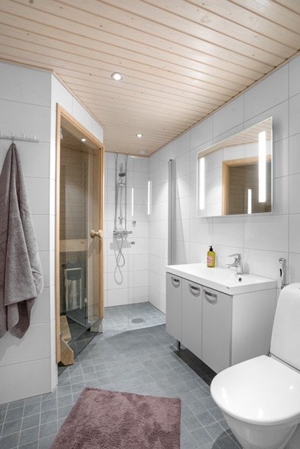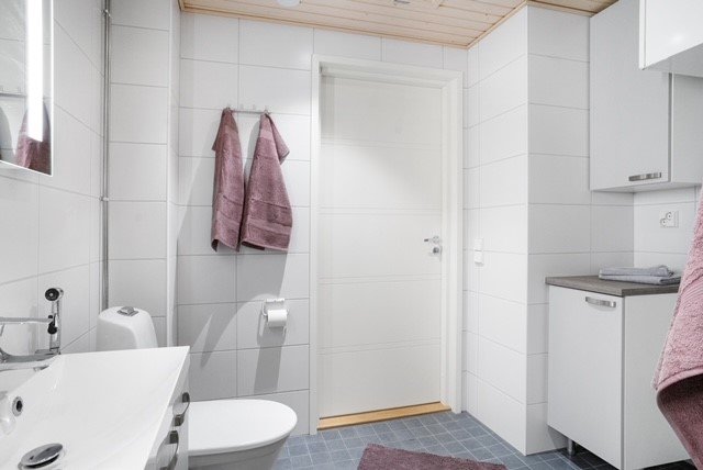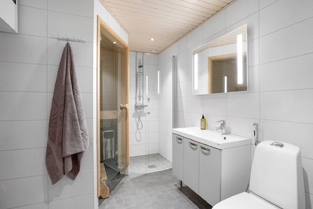 - WC-istuin, suihku, suihkuseinä, pesukoneliitäntä, peili, pesuallas, allaskaappi, ja bidee-suihku